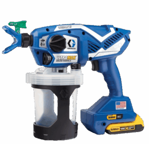 Tragbares Akku-Airlessgerät für Reparatur- und Ausbesserungsarbeiten im Innenbereich. Verarbeitet je nach Gerät Wasserlacke oder Lösemittelmaterial.